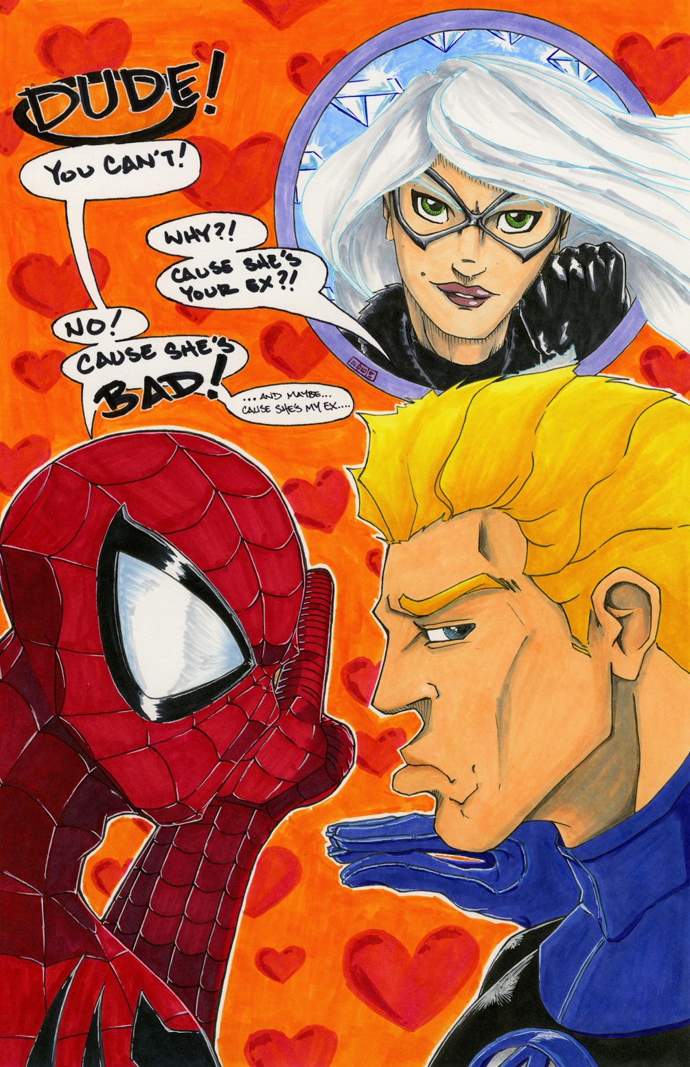 Always wanted to create a piece with Spidey and Johnny Storm and after learning about recent developments with Johnny Storm and Black Cat thought this would be the piece to create. I kind went with the old covers that had word balloons and teased what was going to happen in that issue of the comic. Traditional hand-drawn on 11x17 paper, colored with a combination of Copic, Prismacolor and Sharpie markers and of course Sakura white pen for the highlights. Prints will be oversized; 12x18.